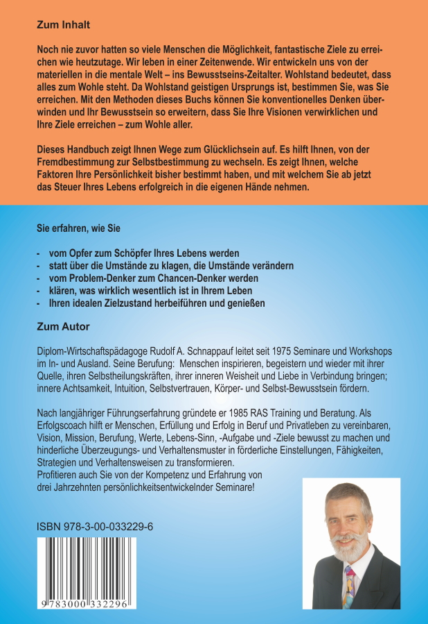 Text der Buch-Rückseite: Zum Inhalt Noch nie zuvor hatten so viele Menschen die Möglichkeit, fantastische Ziele zu erreichen wie heutzutage. Wir leben in einer Zeitenwende. Wir entwickeln uns von der materiellen in die mentale Welt – ins Bewusstseins-Zeitalter. Wohlstand bedeutet, dass alles zum Wohle steht. Da Wohlstand geistigen Ursprungs ist, bestimmen Sie, was Sie erreichen. Mit den Methoden dieses Buchs können Sie konventionelles Denken überwinden und Ihr Bewusstsein so erweitern, dass Sie Ihre Visionen verwirklichen und Ihre Ziele erreichen – zum Wohle aller. Dieses Handbuch zeigt Ihnen Wege zum Glücklichsein auf. Es hilft Ihnen, von der Fremdbestimmung zur Selbstbestimmung zu wechseln. Es zeigt Ihnen, welche Faktoren Ihre Persönlichkeit bisher bestimmt haben, und mit welchem Sie ab jetzt das Steuer Ihres Lebens erfolgreich in die eigenen Hände nehmen. Sie erfahren, wie Sie